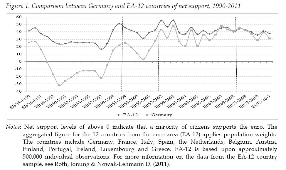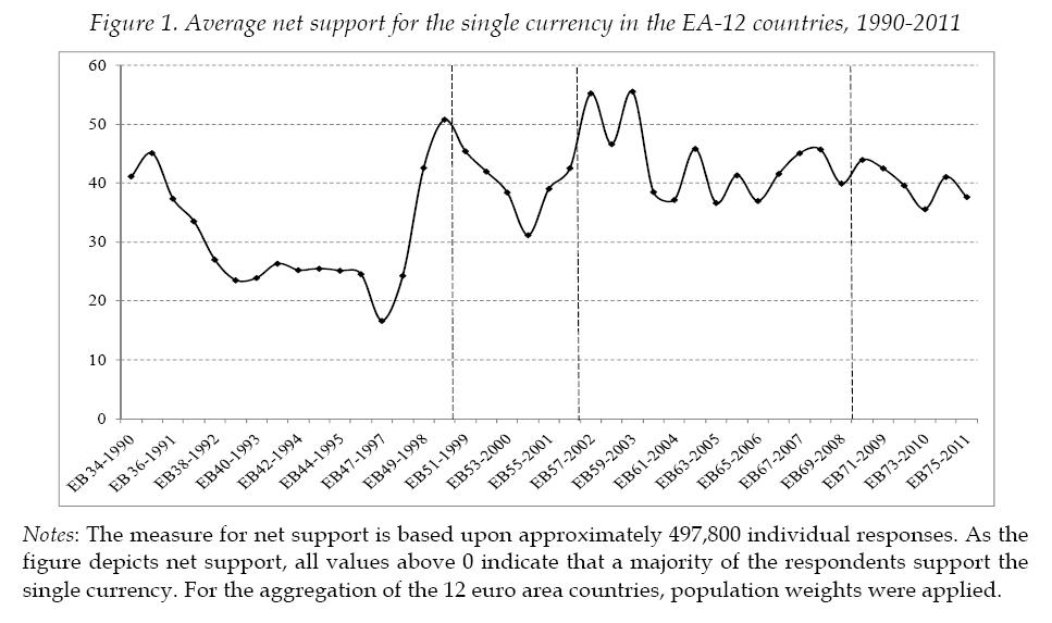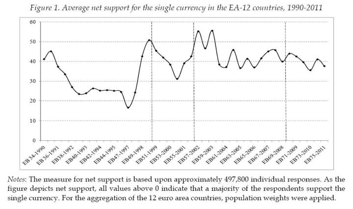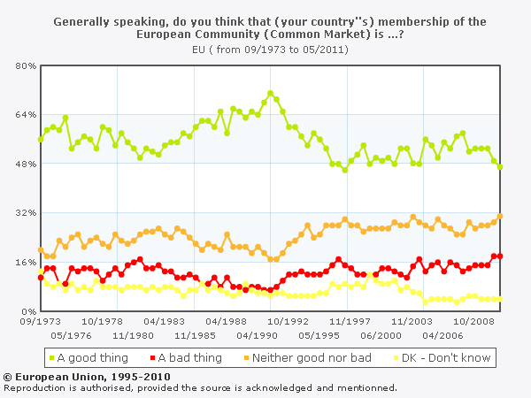 Dei fleste tyr til Europakommisjonens Eurobarometer for å måla lange trendar i folks holdningar til EU. Eurobarometer har undersøkt dette kvar vår og haust sidan 1973, og sporadisk også før det. Nokre spørsmål har vore identiske i heile perioden, mellom anna om EU-medlemskap har vore ei god eller dårleg sak for vedkomande medlemsland. Det viser seg at det er høg korrelasjon mellom dette og andre typar spørsmål om holdning til europeisk integrasjon. Grafen nedanfor viser utviklinga frå 1973 til og med våren 2011 for EU under eitt. Når vi ser på grafen, må vi hugsa at EU i 1973 nettopp var utvida frå dei opphavlege seks til ni og sidan har fått 27 medlemsland. Målingsgrunnlaget er dermed blitt mangedobla og EU har endra seg monaleg i perioden.