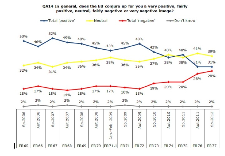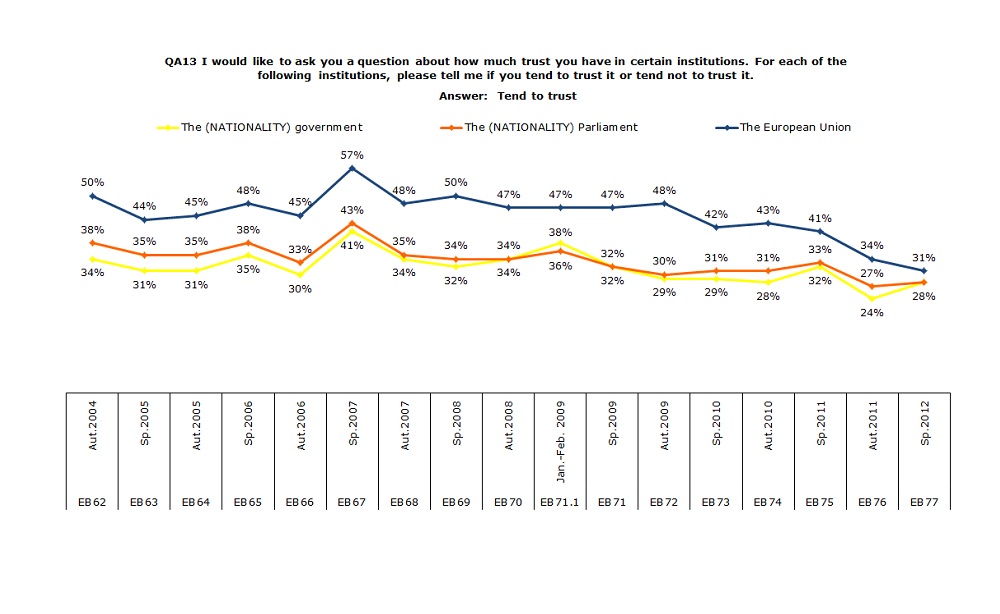 Europakommisjonens faste spørreundesøkelse Eurobarometer har lange tidsserier. De siste resultatene, som bygger på spørsmål stilt i mai og publisert i juli, bekrefter at EU-skepsisen vokser i EU under ett. Under følger noen bilder som viser dette grafisk. Den nederste grafen er kanskje mest interessant. Den viser at tilliten til nasjonale institusjoner også har falt og at den fremdeles er mindre enn tilliten til EU.